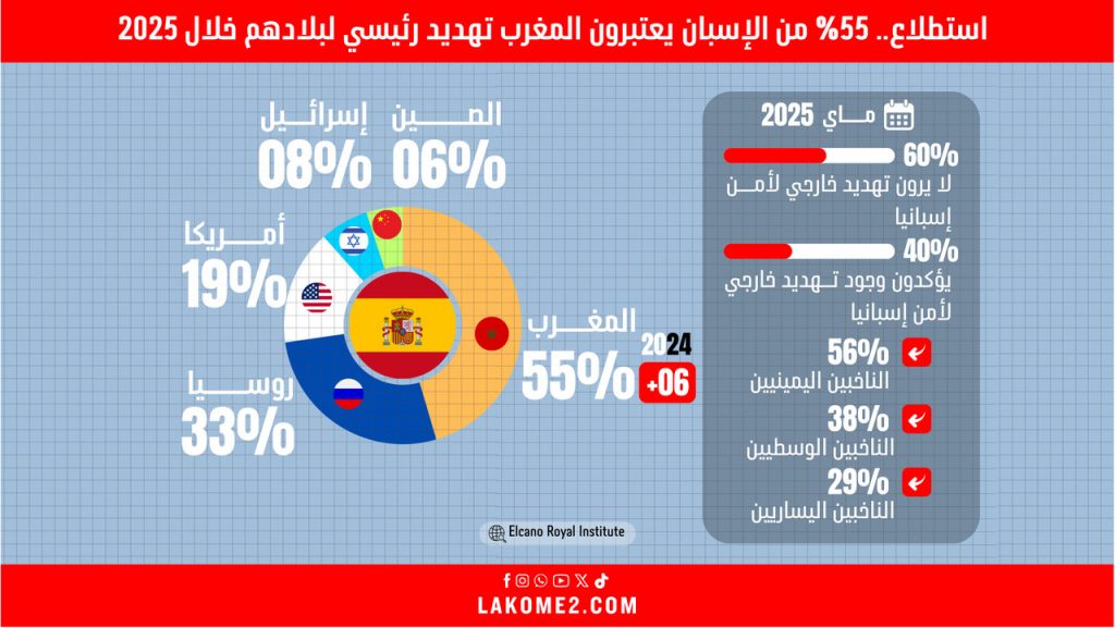 أنفوغرفيك | استطلاع.. 55 % من الإسبان يعتبرون أن المغرب تهديد رئيسي لبلادهم 2025‎
