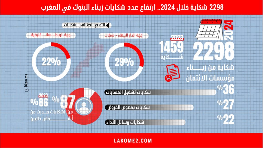 أنفوغرافيك | 2298 شكاية خلال 2024.. ارتفاع عدد شكايات زبناء البنوك في المغرب ‎