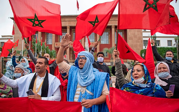 Moroccans celebrate in front of the parliament building in Rabat on December 13, 2020, after the US adopted a new official map of Morocco that includes the disputed territory of Western Sahara. - Western Sahara is a disputed and divided former Spanish colony, mostly under Morocco's control, where tensions with the pro-independence Polisario Front have simmered since the 1970s. Morocco became the fourth Arab state this year, after the United Arab Emirates, Bahrain and Sudan, to announce it had agreed to normalise relations with Israel. US President Donald Trump in turn fulfilled a decades-old goal of Morocco by backing its contested sovereignty in Western Sahara. (Photo by FADEL SENNA / AFP) (Photo by FADEL SENNA/AFP via Getty Images)