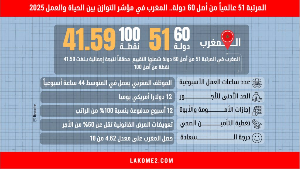 أنفوغرافيك | المرتبة 51 عالمياً من أصل 60 دولة.. المغرب في مؤشر التوازن بين الحياة والعمل 2025‎