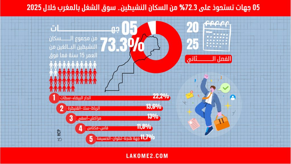 أنفوغرافيك | 05 جهات تستحوذ على 72.3% من السكان النشيطين.. سوق الشغل بالمغرب خلال 2025 ‎